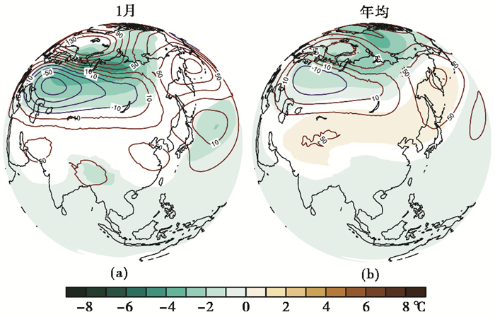 图 5 北美-欧亚冰盖异常导致的500hPa位势高度(等值线,gpm)和温度(填色,℃)变化 冰盖试验EXP3减去变冷试验EXP2,(a)1月,(b)年平均; 图中显示的温度变化超过95 %显著性水平 Fig. 5 Changes in 500hPa geopotential height(contours, gpm)and temperature(shaded, ℃)due to the American-Eurasian ice sheet anomalies, between EXP3 and EXP2, (a)January, (b)annual mean. Only changes in precipitation that are significant at the 95 % confidence level(two-talled unequal t-test)are shown |
