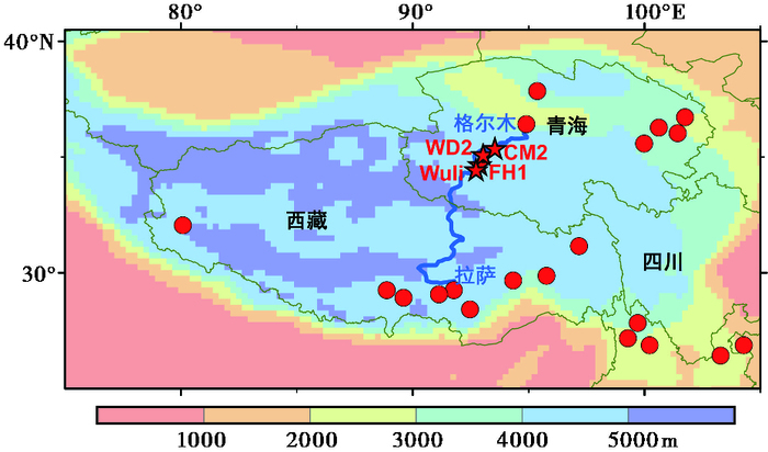 野外钻孔观测资料用于验证深层(1m和6m)土壤温度模拟结果。考虑选取具有较长观测时期(10年以上)的站点和数据的可获得性,收集了4个站(FH1、WD2、CM2和Wuli)的观测资料,其分布如图 1所示,坐标信息如表 1所示。数据的观测时期为1996~2010年,部分站的资料要短于该时期。这些数据主要来自文献[20, 35]。有关观测资料的观测方法、后处理等详细信息可见相关文献[20, 35]。