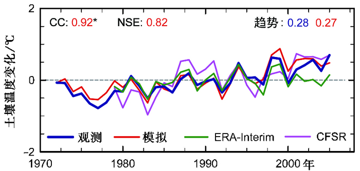 (1) 利用CRUNCEP驱动CLM4.5能合理地模拟出观测的青藏高原土壤温度的年际变化(相关系数为0.92,纳什效率系数为0.82) 和线性趋势(模拟和观测的趋势分别为0.27℃/10年和0.28℃/10年),其结果要明显优于再分析资料。