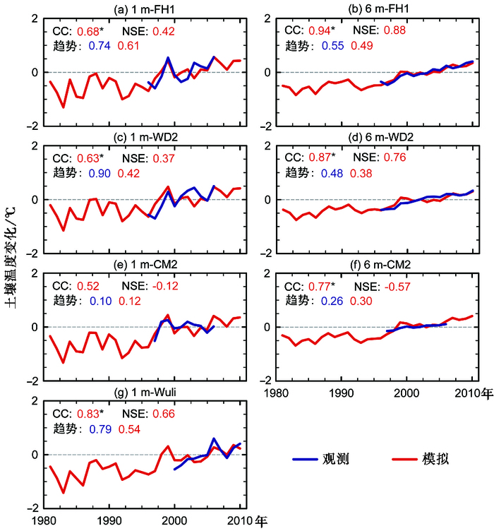 图 3 1981~2010年1m(a,c,e,g)和6m(b,d,f)土壤温度变化(相对各站点的观测时期)模拟结果与各站点观测时期观测值的对比 CC代表相关系数,“*”代表相关系数通过95 %显著性水平,NSE代表纳什效率系数,趋势的单位为℃/10年 Fig. 3 Comparison of simulated change in soil temperature at a depth of 1m(a, c, e, g)and 6m(b, d, f)to observations during the period 1981~2010 relative to observation period of each site. CC represents correlation coefficient, "*" represents the correlation coefficient exceeding 95 % significance level, and NSE represents the Nash-Sutcliffe efficiency |
