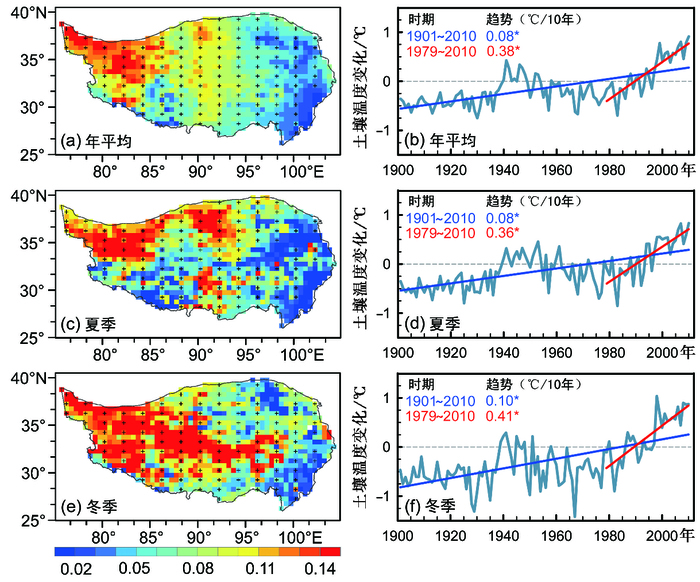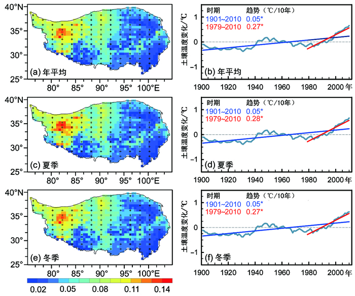 图 4 1901~2010年年平均(a,b)、夏季(c,d)和冬季(e,f)1m土壤温度的趋势(℃/10年)分布(a,c,e)和区域平均线性变化(相对1981~2000年)(b,d,f) “+”代表趋势通过95 %的显著性检验,“*”代表相关系数通过95 %显著性水平 Fig. 4 Distribution(a, c, e)of trend(℃/decade) in soil temperature at a depth of 1m during the period 1901~2010 and the related area-average linear change(b, d, f)relative to 1981~2000 for annual(a, b), summer(c, d)and winter(e, f). "+" represents the trend exceeding 95 % significance level, and "*" represents the correlation coefficient exceeding 95 % significance level |
