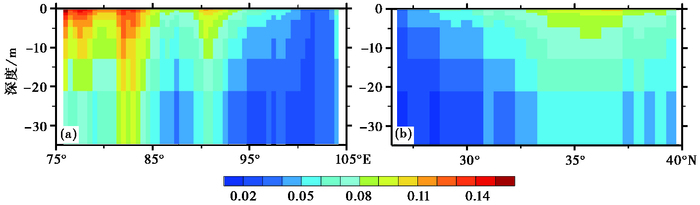 图 6 青藏高原经向(a)和纬向(b)平均的1901~2010年土壤温度变化趋势(℃/10年)分布 深度中的“-”号代表向下,所有趋势都通过了95 %的显著性检验 Fig. 6 Distribution of trend in soil temperature(℃/decade)during the period 1901~2010 for meridional (a) and latitudinal (b) mean over the Tibetan Plateau. "-" in the value of depth represents underground. Trends for all grids exceeding 95 % significance level |