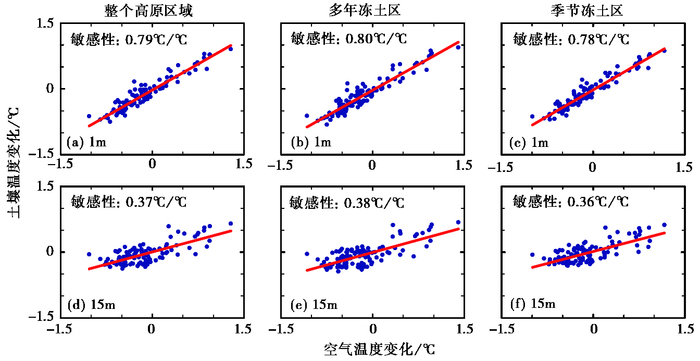 (4) 土壤温度增加主要受气温控制,浅层(1m)土壤温度对气温变化较深层(15m)更敏感,其敏感度分别为0.79℃/℃和0.37℃/℃;多年冻土温度对气候变化较季节冻土更敏感,其1m(15m)深度敏感性分别为0.80℃/℃和0.78℃/℃(0.38℃/℃和0.36℃/℃)。