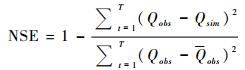 公式(1) 中Qobs代表观测值,Qsim代表模拟值,Qobs代表观测值的平均,T为总样本数。NSE表示模拟和观测值接近1︰1线的程度,其对极值敏感。纳什效率系数的范围为-∞到1,1表示观测和模拟值完全相同。系数越接近1,表明观测和模拟值越接近;系数接近0,表示模拟值接近观测值的平均水平,总体结果可信;系数远小于0,则模拟结果不可信。