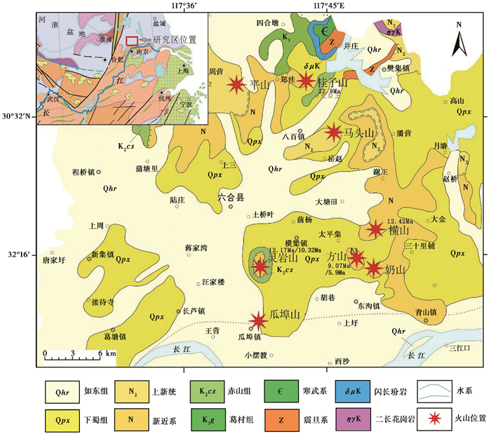 图 1 六合地区火山位置图 图中玄武岩年龄来自文献[2, 6, 8]研究数据 Fig. 1 Location map of volcanoes in Liuhe area, the basalt age in the map is derived from previous research data[2.6.8] |