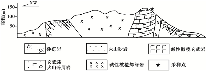 为了进一步更好地认识六合地区新近纪玄武岩的期次与时代,并限定该区古长江三角洲的形成时代,重点采集了六合地区的方山(采样点:32°18′29.07″N,118°59′20.80″E;海拔171 m)、灵岩山(采样点:32°17′49.69″N,118°53′24.95″E;海拔102 m)和奶山(采样点:32°17′59.16″N,119°00′24.69″E;海拔124 m)共3个不同火山锥的玄武岩Ar-Ar年龄样品。样品选自新鲜出露面,岩性均为方山组灰黑色碱性玄武岩,质地坚硬,呈致密块状构造(图 2和图 3)。以灵岩山地质剖面为例岩性描述如下: