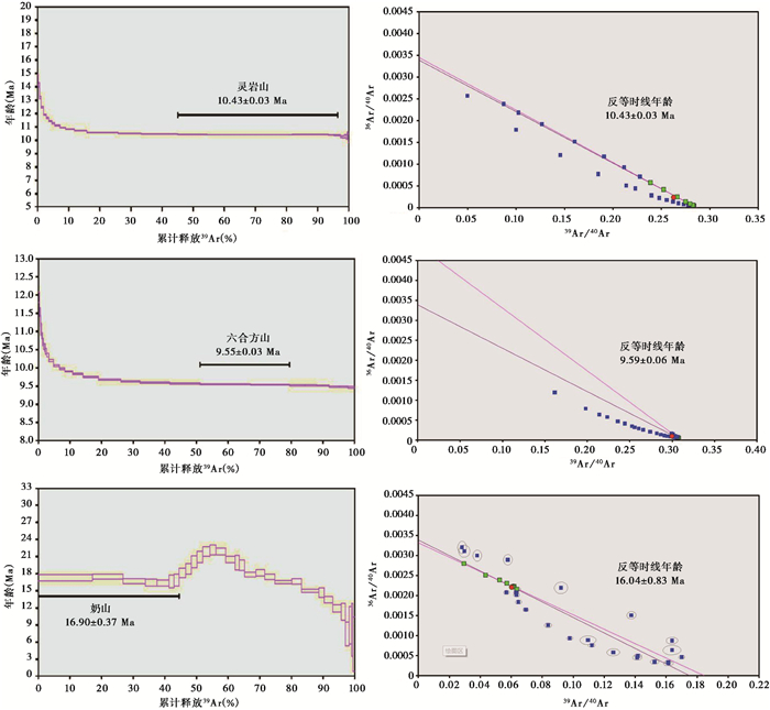 测试结果显示(图 4),奶山玄武岩样品在前部加温阶段组成一个平坦的年龄坪,坪年龄为16.90±0.37 Ma,相应的36Ar/40Ar-39Ar/40Ar等时线年龄为16.04±0.83 Ma(MSWD=1.83);六合方山样品在连续加温阶段组成一个平坦的年龄坪,坪年龄为9.55±0.03 Ma,反等时线年龄为9.59±0.06 Ma(MSWD=0.18);灵岩山样品的坪谱平坦,坪年龄为10.43±0.03 Ma,反等时线年龄为10.43±0.03 Ma(MSWD=0.38)。3个样品的坪年龄与反等时线年龄几乎完全一致,而且初始40Ar/36Ar值为285.8~305.1,与一般采用的现代空气氩比值(295.5±5)相近,反映所测样品的年龄真实可靠,年龄结果可以代表玄武岩的喷出时代。