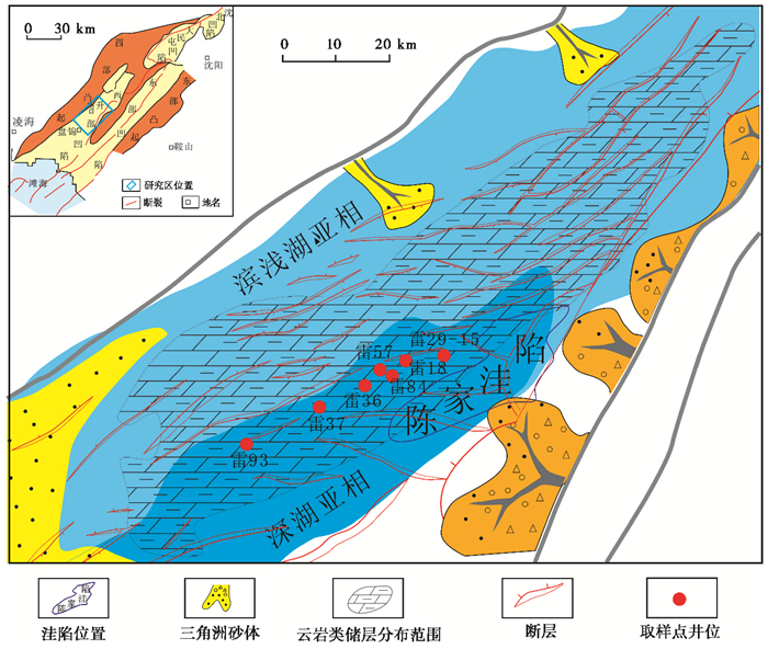 1 地质背景雷家地区构造上位于辽河坳陷西部凹陷中北部,面积约为300 km2,沙河街组四段沉积时期为咸化湖盆闭塞湖湾环境(图 1)。西部凹陷断陷湖盆东陡西缓,断裂系统发育,泥质云岩和混积岩储层主要发育在缓坡带(孟卫工等,2010;宋柏荣等,2015)。杜家台油层(Es4d)为雷家—高升地区的主力产油层之一,位于沙河街组四段(Es4)顶部,厚度为20~140 m。根据岩性组合特征,杜家台油层自上而下又分为3个油层组,其中,杜三段油组(Es4d3)为一套由白云石、方沸石和泥质(包括细粉砂)混合形成的沉积岩,以白云岩类储层为主,局部方沸石含量增多形成方沸石岩,为杜家台油层组的主力储层发育段(孟卫工等,2010;宋柏荣等,2015)。方沸石是一种富钠的铝硅酸盐矿物,在杜三段储层中常见。国内许多学者(朱国华,1985;孙玉善,1993;韩守华等,2007;李红等,2012;张跃等,2015)对方沸石的物质来源、形成环境和成岩作用进行了探讨,发现其形成受咸化水体、地热流体等多种因素的影响,其存在能影响岩石的孔隙度和渗透率,进而决定储层质量。