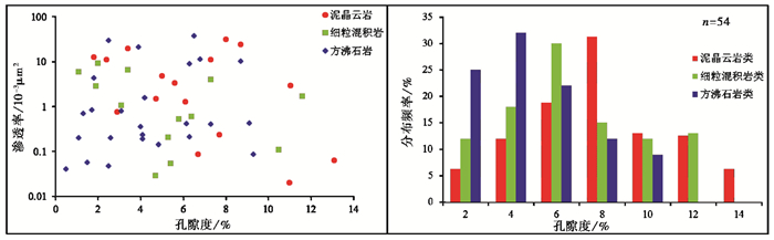 3大类储层孔隙度为2%~14%,渗透率为0.01×10-3 μm2~100×10-3 μm2,不同岩性储层孔隙度、渗透率无明显差别。根据孔隙度频率分布统计结果,白云岩类储层孔隙度相对较高,平均孔隙度为6%~7%,细粒混积岩储层孔隙度其次,平均孔隙度为5%~6%,方沸石岩类储层孔隙度相对最低,平均孔隙度为4%~5%(图 2)。