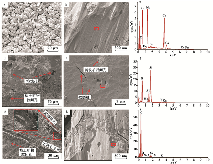 图 4 杜三段不同储层微观孔隙结构特征 a. L29-15井,2 630.8 m,泥晶云岩,白云石晶间孔发育,孔径为1~4 μm,白云石晶粒间发育溶蚀孔,孔隙连通性好;b. L37井,2 701 m,泥质泥晶云岩,白云石中发育大量纳米级溶蚀孔,孔径为1~20 nm;c.图b中红色框处的能谱图,表示发育纳米级溶蚀孔的矿物为白云石;d. L36井,2 572.5 m,云质方沸石岩,粒间溶蚀孔被方沸石充填,方沸石中发育溶蚀孔,孔径为10~30 μm;e. L57井,2 448.3 m,泥质泥晶云岩,发育收缩缝、溶蚀孔、微孔;f.图e中红色框处的能谱图,溶蚀孔中充填物为石英;g. L57井,2 350.1 m,细粒混积岩,方沸石充填裂缝,原始裂缝宽度为10~25 μm,方沸石中发育溶蚀孔;h. L37井,2 703 m,细粒混积岩,发育纳米级溶蚀孔、微裂缝,裂缝宽度 为5~10 nm;i.图h中红色框处的能谱图,显示暗色部分为有机质,有机质孔隙不发育 Fig. 4 Micro pore-fracture types and radius of different reservoirs in Es4d3 |
