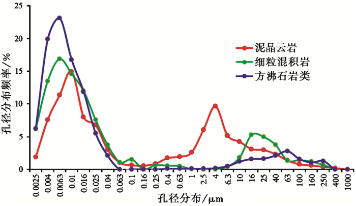 不同储层的孔径分布特征表明,白云岩类储层微微米孔及其以上孔径的孔喉所占比例最大,孔径分布的范围也最宽,从1~400 μm都有分布,孔喉来源于溶蚀孔和白云石粒间孔,孔喉结构较为均质。细粒混积岩类储层和方沸石岩类储层孔喉结构非均质性较强,微微米孔不发育,孔喉大小分异明显。处于中微米孔范围的为碎屑矿物粒间孔、溶蚀孔,其余孔隙多位于纳米孔范围内。