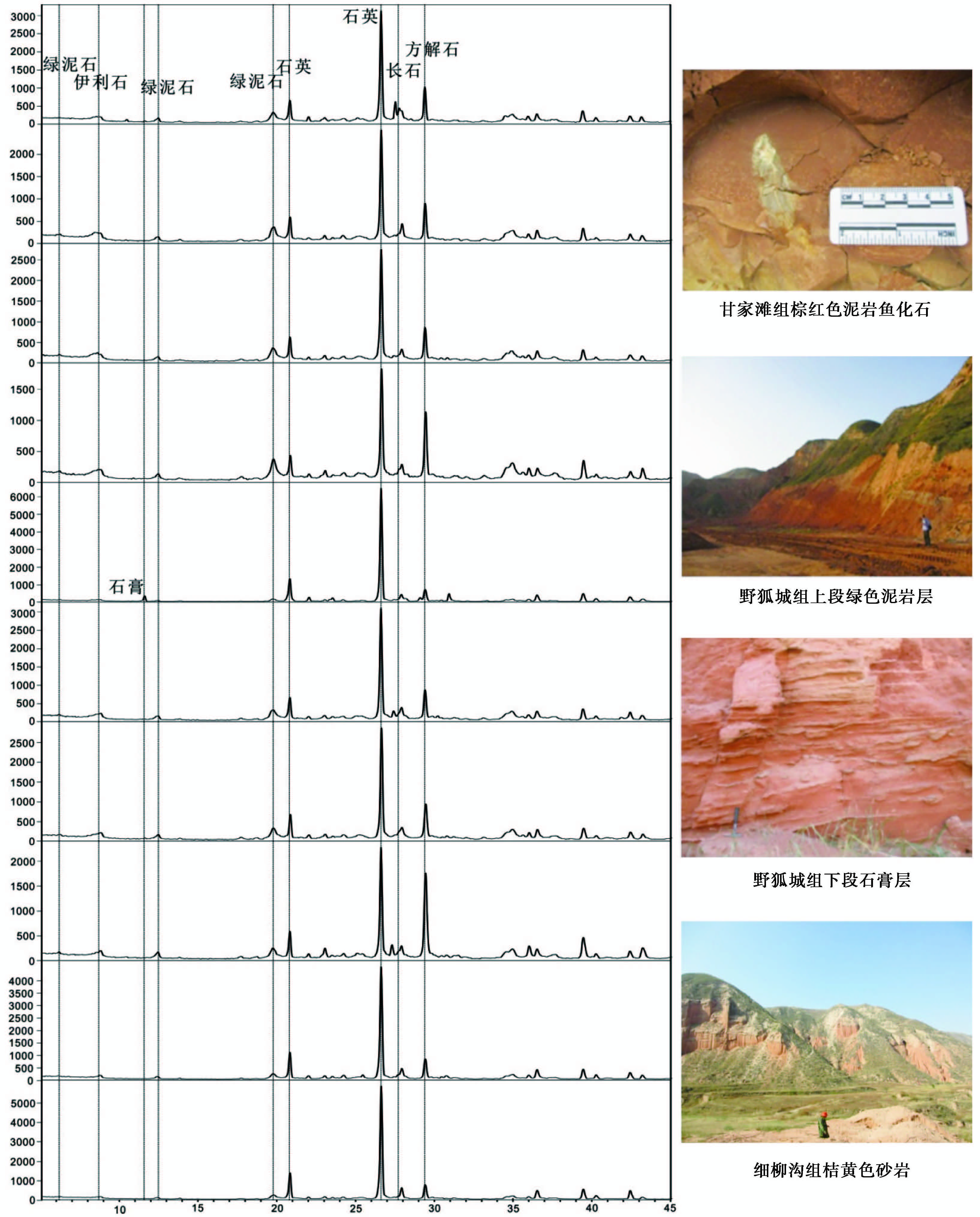图2 泥岩X衍射图与野外照片 Fig.2 X-ray diffraction pattern of mudstone and field pictures |