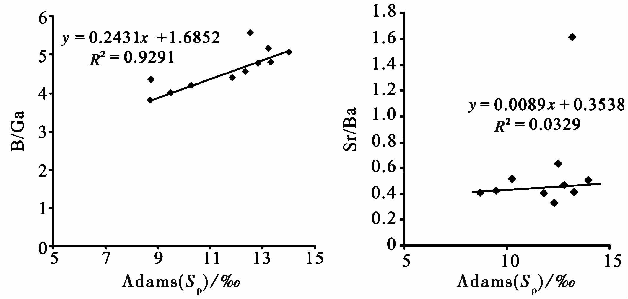 图3 古盐度值与B/Ga、Sr/Ba关系图 Fig.3 The relation between paleosalinity and B/Ga, Sr/Ba in Lanzhou Basin |