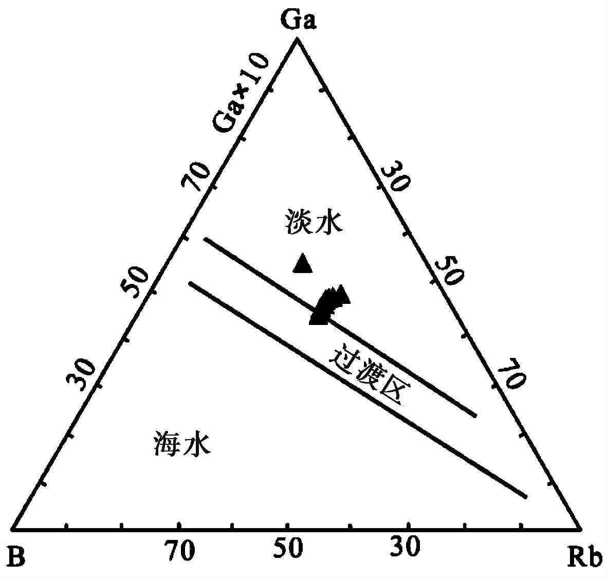 从Ga-B-Rb元素三角图(大森昌卫等, 1980), 来分析泥岩样品所反映的大环境, 结果显示兰州盆地古近系为内陆微咸水—淡水湖泊, 接近过渡区边缘(图 4), 局部层位处于半咸水环境, 与上述Walker(1968)“相当硼”、Adam法和Couch法算出的盐度值、B/Ga值及Sr/Ba值所反映的环境完全一致, 即兰州盆地古近系处于半咸水—淡水湖泊环境, 测试分析数据可信。