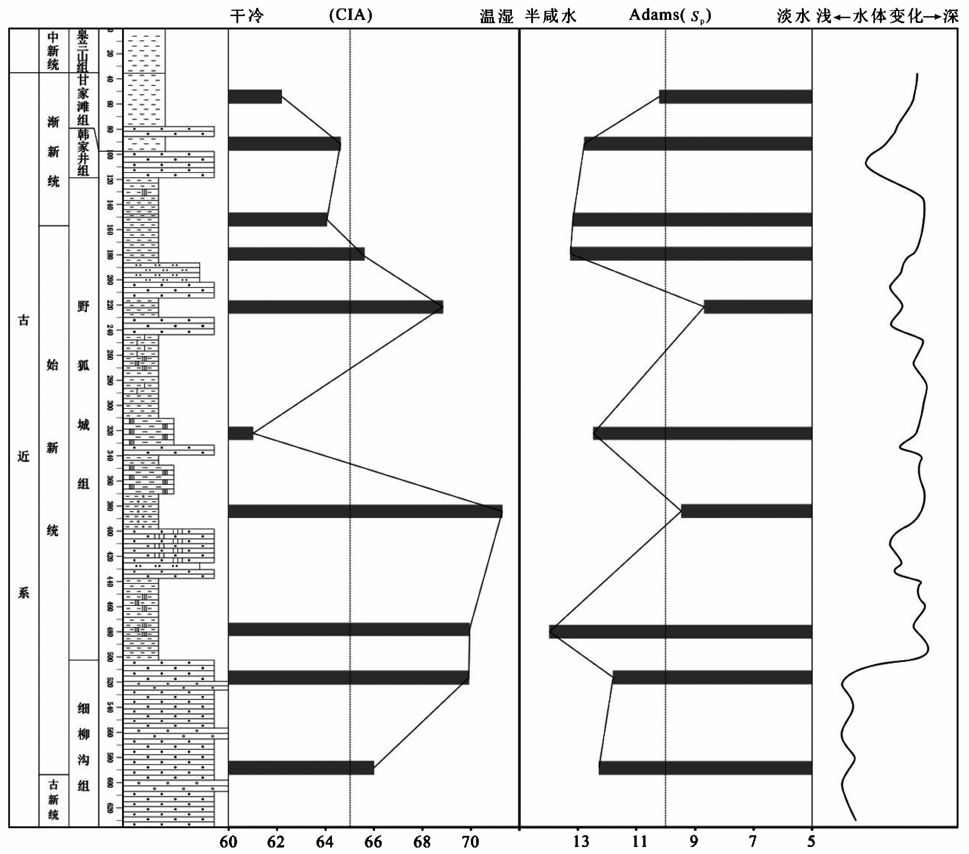 (5) 研究表明古盐度的变化受沉积相、水体变化及气候变化综合影响。细柳沟期, 气候湿润, 以冲积扇沉积为主, 水体较浅, 盐度值较大, 到野狐城中期水体加深, 变为湖相沉积, 气候温暖湿润, 盐度值降低, 同时存在一明显的干冷气候间隙(CIA低值), 该间隙期湖盆蒸发量大于补给量, 盐度值升高, 从野狐城晚期开始湖盆逐渐缩小, 以滨湖相沉积为主, 至韩家井期以河流相为主, 盐度值升高, 到甘家滩期再次变为浅湖相, 盐度值又再次降低, 从野狐城晚期开始风化程度明显降低, 表明晚期气候逐渐变冷变干。