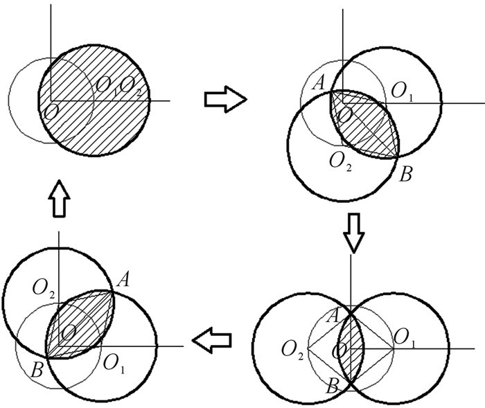假设开始时定盘阀和动盘阀的过流孔重合,此时过流面积最大。过流孔的半径为r,过流区域中心O1与中心轴存在偏心距e,动盘阀绕中心轴作行星运动,运动速度与螺杆的运动速度ω相同。动盘阀绕中心轴作行星运动时,动盘阀圆心O2的轨迹为圆心为O点的圆,过流面积具体的变化过程如图 4所示。