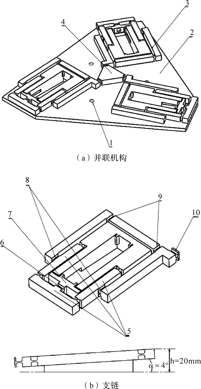 | 1—固定螺栓孔;2—静平台;3—柔性支链;4—动平台;6,8,9,10—柔性转动副;5,7—柔性移动副. 图 1 3-RPRR类平面全柔性并联机构及其支链 图 1 3-RPRR类平面全柔性并联机构及其支链 Fig. 1 3-RPRR planar fully compliant parallel mechanism and its branched chains |