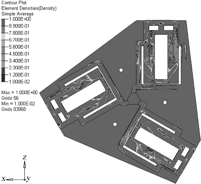 | 图 3 3-RPRR类平面全柔性并联机构拓扑优化结果 Fig. 3 Topology optimization results of 3-RPRR planar fully compliant parallel mechanism |