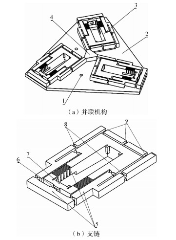 1 3-RPRR类平面全柔性并联机构设计基于3-RPRR并联机构原型,以型综合法为理论依据,通过研究传统并联原型机构的空间几何矢量约束关系,在整体板材上通过先进的线切割技术切出与原型机构各运动副相对应的柔性运动副,将各柔性运动副运动轴线的相对几何关系与并联原型机构各运动副运动轴线的相对几何关系保持一致,设计出3-RPRR类平面全柔性机构及其支链,如图 1所示.3-RPRR类平面全柔性机构有3条支链,每条支链由3个转动副(R副)和一个移动副(P副)组成.在全柔性支链中,以柔性移动副7作为驱动副,为了使RPRR全柔性支链具有良好的运动特性,设计2组相对于移动副7的辅助转动副8和9,共同实现支链转动副的运动特性.