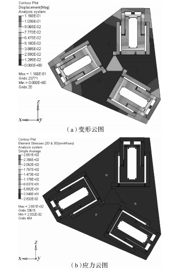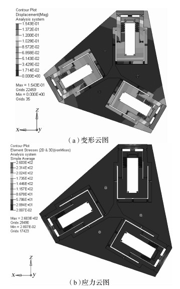 | 图 6 优化后机构变形云图以及应力云图 Fig. 6 Deformation cloud and stress cloud of optimized mechanism |