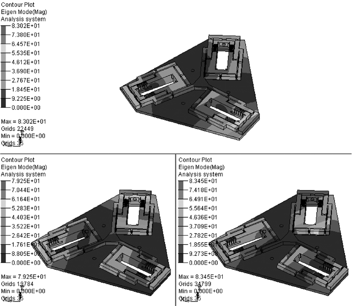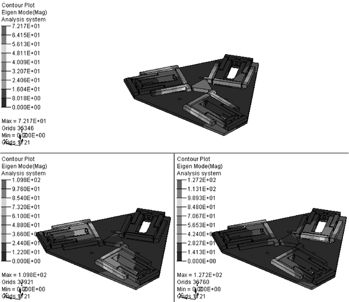 | 图 8 优化后机构的前3阶振型图 Fig. 8 Former three order vibration model charts ofoptimized mechanism |