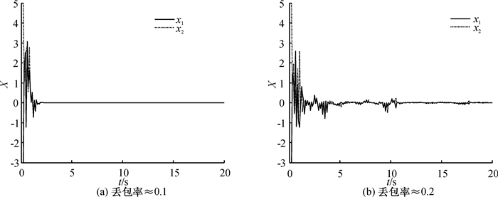 3 仿真研究 3.1 数值模型建立为了便于对比加入丢包算子之后的响应曲线,本文选择与文献[6]相同的数值模型,即线性化后的倒立摆简化的状态方程[11]: