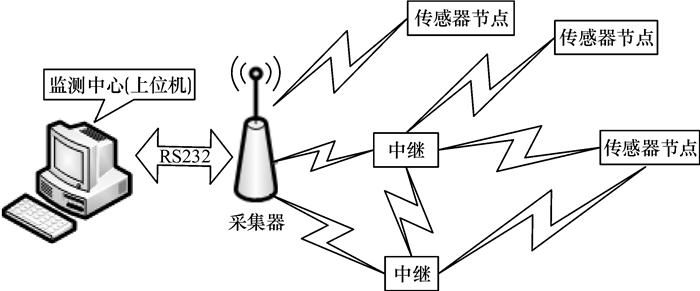 2 系统总体结构及原理基于ZigBee的船用气囊压力采集系统结构主要由采集器、传感器节点、中继器以及用于数据显示的上位机等4部分组成,并从传输链路的可靠性和网络的稳定性角度考虑,采用网状网(MESH)作为本系统的ZigBee网络拓扑结构.系统工作原理如图 1所示,采集器上电启动后就通过应用层、网络层、MAC层之间一系列网络原语通信[6],完成网络PANID、网络信道等参数设置,便建立起ZigBee网络,并进入等待其他子节点加入.中继和传感器节点通过寻找与指定PANID相匹配的网络并加入网络,成功加入后,传感器节点定时对船用气囊气压进行采集和处理,并将包含有传感器节点短地址、编号、气压值等内容的数据通过ZigBee网络发送给采集器,采集器则将接收到的数据进行处理后经RS232上传到上位机,上位机完成数据处理、分析、存储和集中显示等功能.