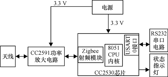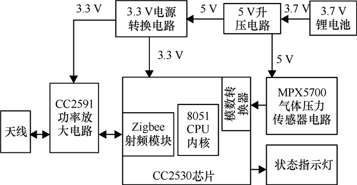 采集器和中继器在本设计中采用相同硬件电路,该硬件电路主要由CC2530、CC2591芯片及其外围电路、RS232电平转换电路、状态指示灯电路及3.3 V电源电路组成,其电路结构如图 2所示.对于传感器节点电路设计,其硬件电路主要CC2530、CC2591芯片及其外围电路、MPX5700实现电路[8]、状态指示灯电路及不同器件所需的电源电路,其结构框图如图 3所示.由于MPX5700的电源电压范围在4.75~5.25 V之间[9],因此在传感器节点电路中外加了一个从3.7V到5V的升压电路,该升压电路通过电源升压芯片FAN4855[10]实现,而主控制器CC2530芯片的供电电源则通过3.3 V线性稳压芯片实现.