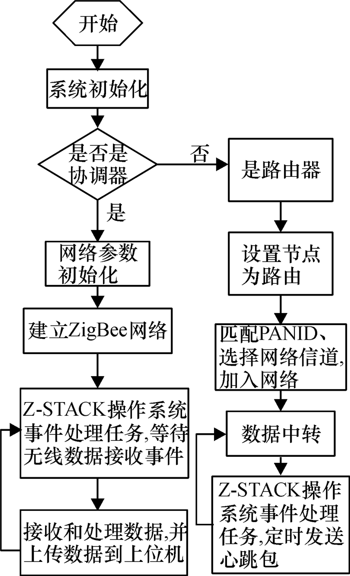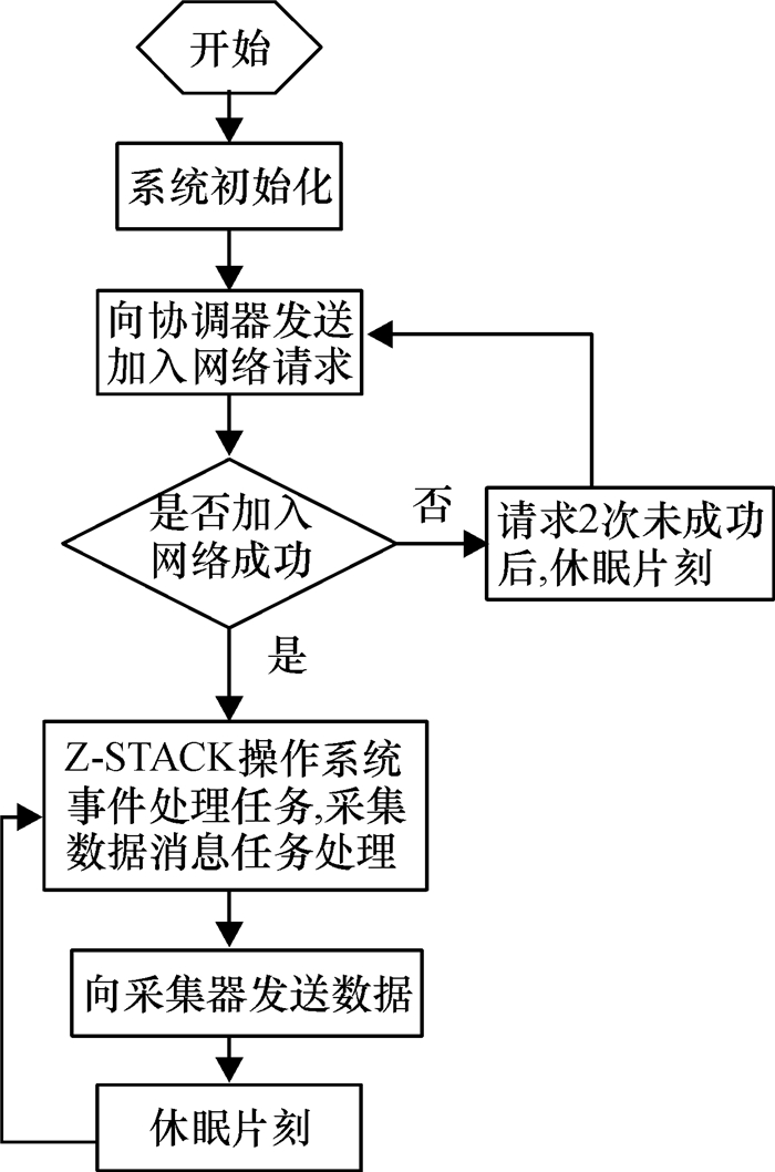 3.2 软件设计整个系统软件主要是基于TI的Z-Stack 2007协议栈进行开发的,在该协议栈中内嵌有一个基于优先级轮询的操作系统,协议栈程序通过该操作系统进行任务管理和事件响应,可以有效提高程序运行效率[11].针对本系统程序设计,软件设计主要分为采集器、中继器和传感器节点3部分,如图 4所示,采集器上电启动后经过一系列系统初始化和网络参数初始化建立起ZigBee网络,网络建立后采集器便承担起网络管理、接收传感器节点上传的数据、与上位机通信等任务;而中继器上电后经过系统初始便寻找和加入ZigBee网络,它主要负责网络管理、数据中转、心跳包的发送等任务,心跳包的发送有助于采集器确认中继是否在线.如图 5所示,传感器节点上电后经系统初始化后,向匹配的网络发出加入请求,成功加入网络后便采集气囊气压和上传数据,完成后进入休眠状态,以减少功耗.