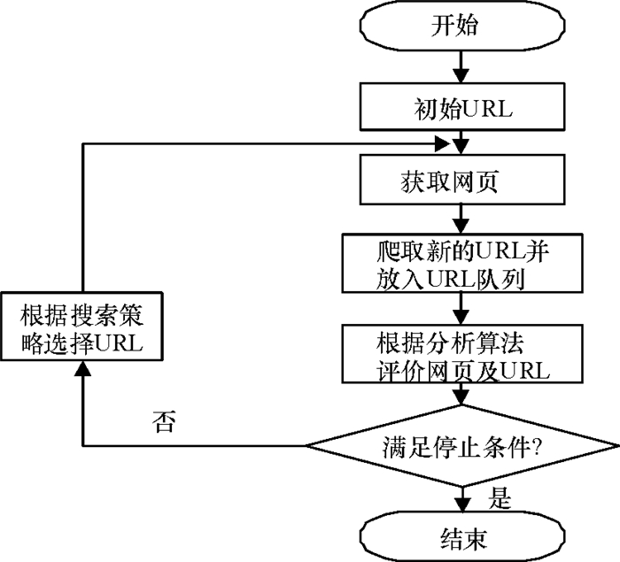 通用的爬虫是从一个或者多个初始的URL开始进行爬取,在获得初始URL抓取网页内容的过程中,不断从当前的网页中抽取新的URL并放入队列,直到满足系统设定的爬取深度条件后停止.聚焦爬虫的工作相比较为复杂,需要根据一定的网页分析算法过滤去除与主题无关的URL,存储有用的并将之放入等待队列中,然后根据搜索条件从中选取下一步要爬取的URL,重复直到满足停止条件为止[6].同时,所有被爬虫爬取过的网页将会被存储起来,然后通过分析、过滤并建立索引,以便后续的查询和检索.这个过程所得到的分析结果还可以对之后的抓取过程给出指导反馈.聚焦爬虫工作流程如图 3所示.
