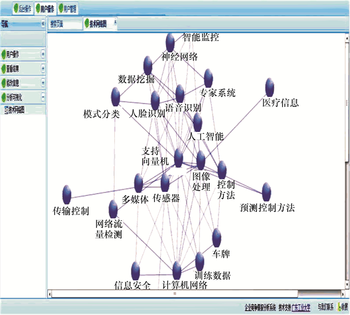 4.4 分析可视化界面通过对情报信息的一系列操作后,根据结果生成关于某一具体类别的技术网络图,通过技术网络图可以帮助企业了解信息间的关联,从而更好地作出决策,网络图如图 6所示.