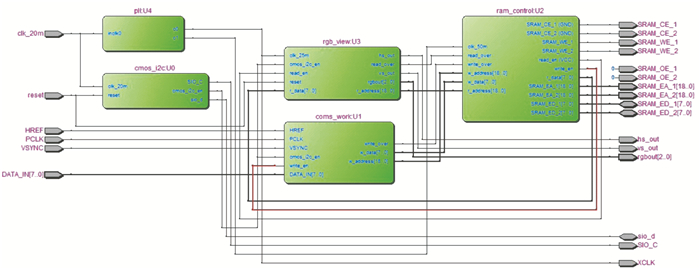 时钟模块把输入FPGA的20MHz时钟进行倍频,生成25MHz与50MHz时钟,分别输入VGA显示模块和存储器控制模块.图像采集模块的输入时钟为20MHz,该模块由I2C配置模块和图像数据采集模块构成,图中所示为cmos_i2c与cmos_work两大模块.在cmos_i2c模块中对寄存器进行配置,输出时钟SIO_C与双向数据sio_d.cmos_work, 主要完成取亮度信号的同时过滤掉色差信号的功能,最后输出写地址信号w_address与数据w_data.存储器控制模块对两片SRAM进行乒乓操作,即主要对图像采集模块输出的数据w_data进行乒乓读写.上述乒乓操作主要是由read_over与write_over两个输入信号进行SRAM读写切换,即采集到的数据进行SRAM存储与SRAM数据输出至VGA显示模块.最终,VGA显示模块对VGA显示的时序进行控制,达到很好的VGA显示效果.