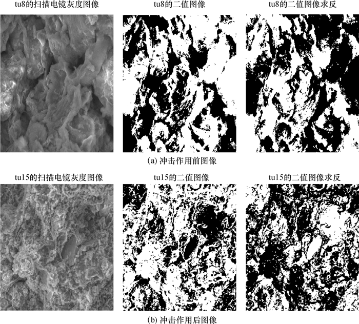 用QUANTA-400型扫描电镜进行拍摄,经图像处理,得到三轴冲击荷载前后软黏土微结构图片如图 1所示.提取了孔隙特征和几何形态共8个参数,分析对比冲击荷载作用前后的软土微观结构参数,得各参数变化呈现下列规律[13].
