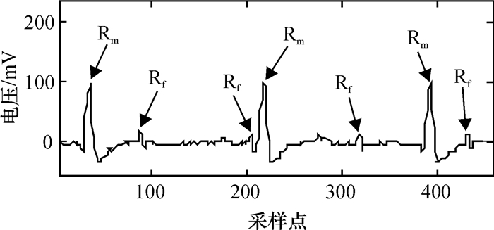 1.1 获取稀疏区域通过现有的母体心电以及胎儿心电的监测及定位方法[10-11],分别得到观测信号中母体心电与胎儿心电R波位置,如图 1所示.其中,Rm与Rf分别是母体心电与胎儿心电的R波位置.再根据成人与胎儿心电信号的长度信息估计出母体心电与胎儿心电的PQRS波段所占的时域范围,从而找到没有发生混叠的时段.分别截取出各路观测信号中没有出现混叠的母体心电与胎儿心电相对稀疏的区域,组成新的信号ki(n), n=1, 2, …, M; i=1, 2, …, N.其中M为由稀疏区域组成的新信号的长度,N表示一共有N路观察信号.