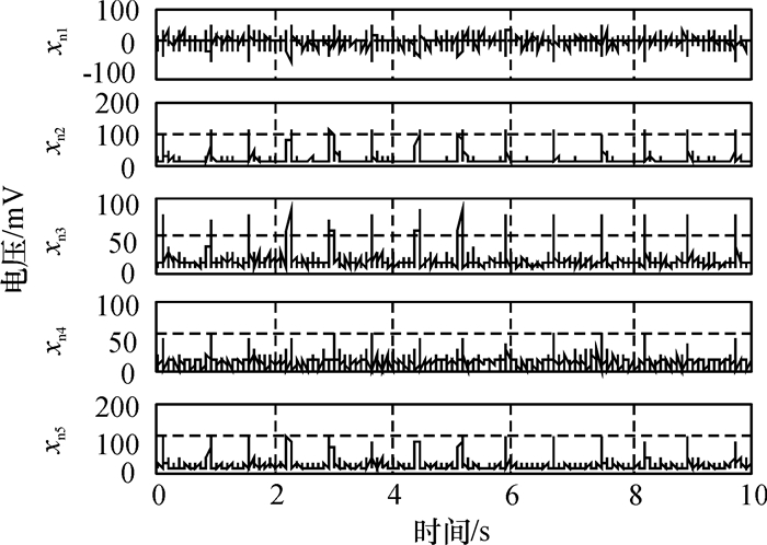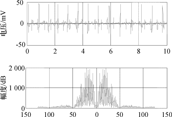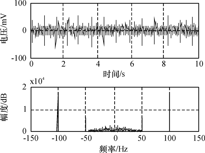 但是,在实际的心电采集中,常常会遇到各种干扰,而这些干扰可能会影响到相关性判断的结果.下面将模拟存在工频干扰的情况:在原始观测信号x1~ x5中,分别引入工频干扰信号,并将它们视为在实际的采集过程中所采集到的带有噪声干扰的心电信号xn1~ xn5,如图 8所示.图 9给出了对其中一路含噪信号xn1作时频域分析的结果,其中可以看到信号中存在明显的工频干扰,即频率为50 Hz及100 Hz的干扰成分.在不对xn1~ xn5作任何去噪处理的情况下,同样截取信号的稀疏区域,组成新的信号kn1~ kn5,并利用文章中提到的相关性判断方法进行测量,测量结果如表 3所示.从表 3中可以看到,在引入噪声后,如果不作去噪处理直接进行相关性计算,其结果与信号的真实值存在着明显的误差.