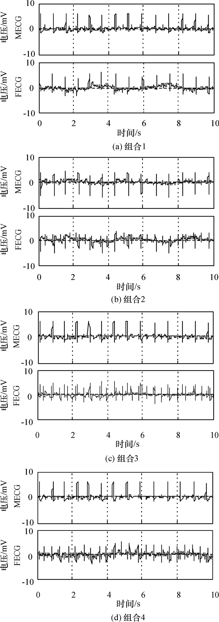 最后,为了验证本判别方法的有效性,本文从中抽取4组相关性测量值由小到大排列的信号组合,并对其进行FastICA处理.4组信号组合分别是组合1:[x3, x4],组合2:[x1, x4],组合:3[x1, x3],组合4:[x3, x5],其相关性测量值分别为C(3, 4)=0.097 0; C(1, 4)=0.313 0;C(1, 3)=0.588 6;C(3, 5)=0.949 6,由表 2可知组合4的相关性最高.4组信号的输出结果如图 13所示.其中,根据胎儿心率要高于成人心率的特点,可以看到输出结果中MECG与FECG分别代表了母体心电以及胎儿心电,而组合4的分离效果显然是最佳的,得到了较为干净的胎儿心电.