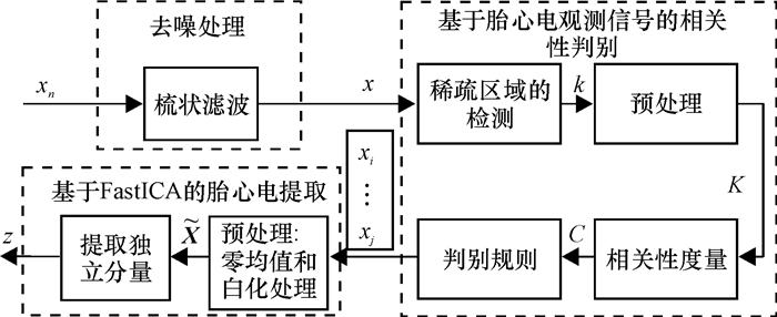 在产科的临床医疗领域,对孕妇进行孕期监测被认为是检测胎儿是否健康发育的最为有效手段之一,因此,产生了多种孕期监测的方法.目前应用最为广泛的是基于超声多普勒原理的胎心率(Fetal Heart Rate, FHR)监护仪[1],该方法通过探头主动发射超声信号作用于胎儿,再根据胎儿心脏的跳动对超声信号的不同反射可以获得胎儿的瞬时心率,从而确定胎儿的健康状况.但也因此被认为是一种“入侵式”的监护方法,基于安全的理由不能长时间使用.而基于胎儿心电(Fetal Electrocardiogram, FECG)监护的方法[2-3]通过母亲腹部的表面电极被动采集胎儿的心电信号[4-5],与传统方法相比,它更加灵敏以及具有更好的安全性,能进行长时间监护,同时采集到的胎儿心电信号能更全面反映胎儿的健康状况,所以可以有效地发现多种胎儿疾病,包括胎儿缺氧、脐带缠绕等.