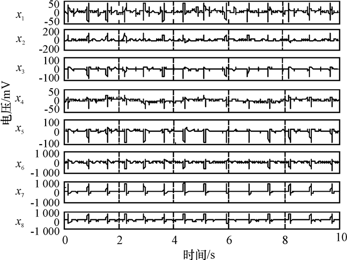 仿真采用De Moor[20]记录的一组8通道的孕妇心电信号,如图 3所示.将编号为x1~ x8,信号对应的采样率为250 Hz,信号长度为2 500,采样时长为10 s.其中x1~ x5为孕妇腹部混叠心电,包含母体心电以及胎儿心电成分; x6~ x8为孕妇胸部的母体心电.在本文的论述与处理中只涉及腹部混叠心电,因此,下面将针对x1~x5这5路信号进行讨论.