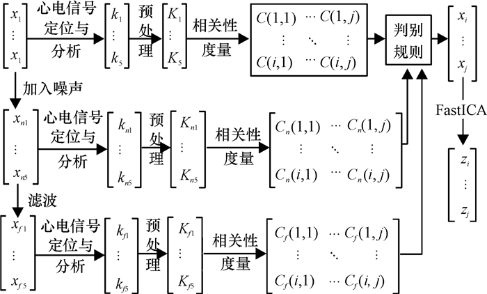 综上所述,本文提出的判别方法可以根据信号间的相关度测量情况,有效地判断观测信号是否满足常规的线性叠加盲分离模型,从而获取到更加适用常规盲分离处理方法的观测信号,大大降低信号处理的难度,使得通过常规的FastICA处理就可以实现胎儿心电的提取.同时,考虑到心电采集过程中会出现噪声干扰,使得信号的相关性被破坏的情况,本文将针对其中最为常见的工频干扰进行相应的滤波处理.整个过程的示意图如图 2所示.