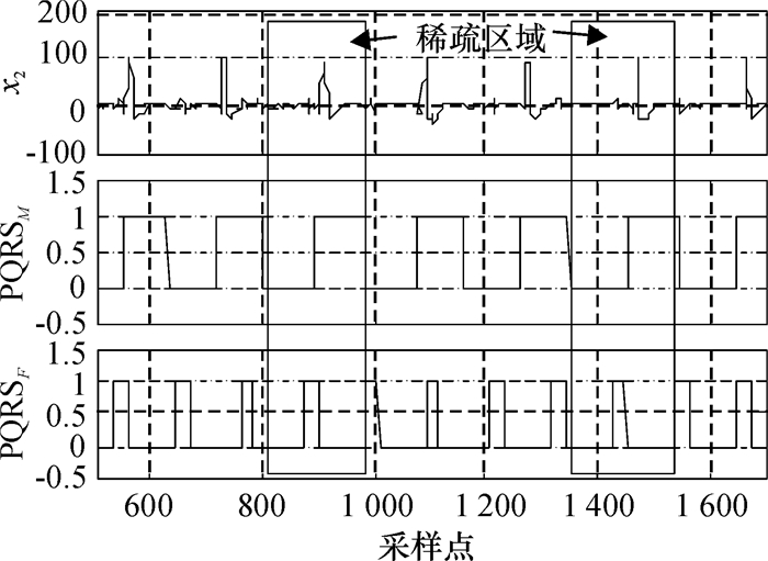 图 5 估计PQRS波段的位置并且找到信号稀疏区域 Figure 5 Result of R-wave detection and the sparse areas of ECG |