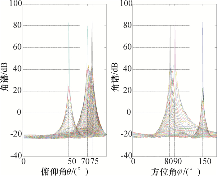 (4) 3个入射角信息,其中信号1为独立信号,信号2、信号3为强相干信号,入射角度分别为:(θ1, φ1)=(80°, 70°)、(θ2, φ2)=(90°, 75°)、(θ3, φ3)=(150°, 50°).