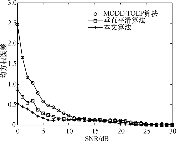 图 5所示为本文算法与文献[8]MODE-TOEP算法与文献[10]垂直平滑算法在不同信噪比条件下DOA估计的均方根误差关系曲线图.由图 5可见,在信噪比SNR<15 dB情况下,本文算法相对于MODE-TOEP算法和垂直平滑算法而言,DOA估计的误差及波动更小,估计精度更高.当SNR>15 dB,3种算法性能均趋于稳定.仿真实验表明,基于两垂直方向虚拟平移的波达方向估算算法在低信噪比环境中,比MODE-TOEP算法[8]和垂直平滑算法[10]DOA估计误差更小,估计精度更高.
