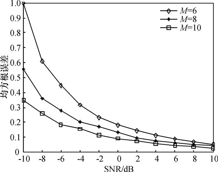 图 6所示为本文算法在不同信噪比下均匀圆阵阵元数M分别为6、8、10的均方根误差曲线图,由图 6可见,随着阵元数的增加,二维估计角度均方根误差不断减小,估计精度相应提高.这是由于均匀圆阵阵元数增加,转化为虚拟均匀线阵的相位模式相应增加,使得接收数据中含DOA估计信息更加丰富具体.但与此同时,阵元数增加会导致硬件成本的增加,所以,在实际应用中,估算精度和阵元数目还应折衷处理.