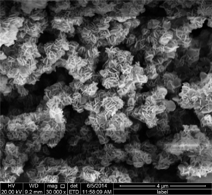 仪器:D-8401型多功能电动搅拌器,恒温水浴锅,扫描电子显微镜(型号:FEI Quanta 650,配备英国Oxford instrument INCA350 X-Max50能谱仪),X射线衍射分析仪(型号:Ultima Ⅲ,生产厂家:日本理学公司),红外光谱仪(型号:Nicolet380, 生产厂家:日本日立),综合热分析仪(型号:NETZSCH TG-209, 生产厂家:德国耐驰).