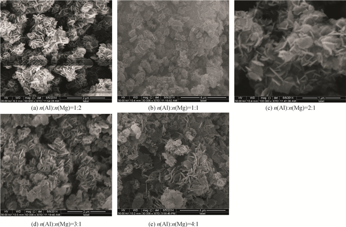 图 3是不同铝镁摩尔比制得的复合阻燃剂颗粒扫描电镜照片,从图 3(a)可知,当n(Al):n(Mg)=1:2时复合阻燃剂的形貌为规则的六方片状,片状厚度为0.20 μm;从图 3(b)可知,当n(Al):n(Mg)=1:1时复合阻燃剂的六方片状形貌开始受到破坏,片状厚度稍微减小,厚度为0.18 μm;从图 3(c)可知,当n(Al):n(Mg)=2:1时复合阻燃剂呈不规则片状形貌,片状厚度继续减小,厚度为0.14 μm,粒度变得不均匀;从图 3(d)可知,当n(Al):n(Mg)=3:1时复合阻燃剂的片状形貌更加不规则,片状厚度为0.13 μm;从图 3(e)可知,当n(Al):n(Mg)=4:1时复合阻燃剂的形貌为很薄的不规则片状结构,片状厚度为0.10 μm.