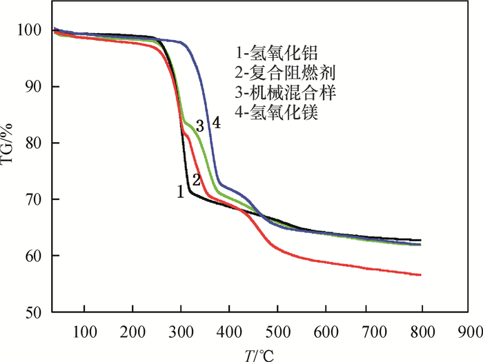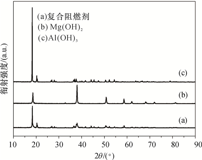 2.2 X射线衍射分析由图 4可知,复合阻燃剂的XRD谱图同时存在Al(OH)3和Mg(OH)2的特征衍射峰,说明没有生成新的物相,证明该材料确实为Al(OH)3/Mg(OH)2复合阻燃剂.同时Al(OH)3的(002),(110) 晶面对应的特征衍射峰强度显著减弱,但衍射峰强度仍比Mg(OH)2强.说明复合阻燃剂以Al(OH)3为基体,表面包覆Mg(OH)2.