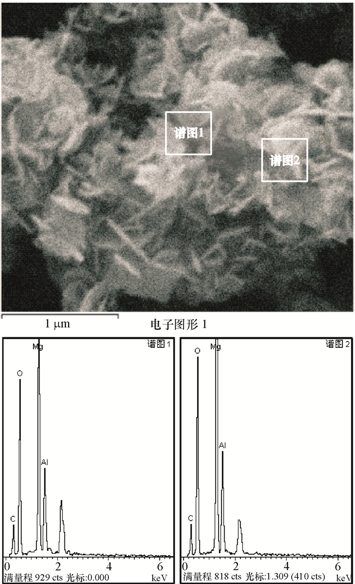 该样品反应原料的n(Al):n(Mg)=1:2,由图 5和表 1的结果可知,用数据平均值计算铝镁摩尔比,得到n(Al):n(Mg)=1:2.08,接近1:2,说明Al(OH)3和Mg(OH)2按接近反应原料的配比很好地进行复合;而且样品中C元素含量很高,说明油酸成功包覆;由表 1结果可知,谱图 1和谱图 2区域中C元素的质量分数分别为24.11%和22.61%,C元素的质量分数相近,说明油酸均匀包覆在复合阻燃剂表面.