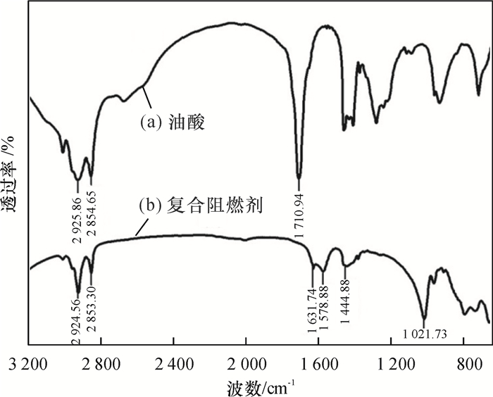 图 6中曲线(a)是油酸的红外光谱图,1 710.94 cm-1为羧酸的C=O的伸缩振动吸收峰,2 925.86 cm-1和2 854.65 cm-1分别是-CH2的反对称伸缩振动峰和对称伸缩振动峰;曲线(b)是复合阻燃剂的红外光谱图,在2 924.55 cm-1和2 853.30 cm-1处出现油酸的-CH2的反对称伸缩振动峰和对称伸缩振动峰,羧酸的C=O的伸缩振动吸收峰消失,原先被C=O的伸缩振动峰覆盖的C=C的振动峰在1 631.74 cm-1出现,同时在1 578.88 cm-1和1 444.88 cm-1处出现了COOM的特征吸收峰(M为金属离子),1 021.73 cm-1为C-O的伸缩振动吸收峰.