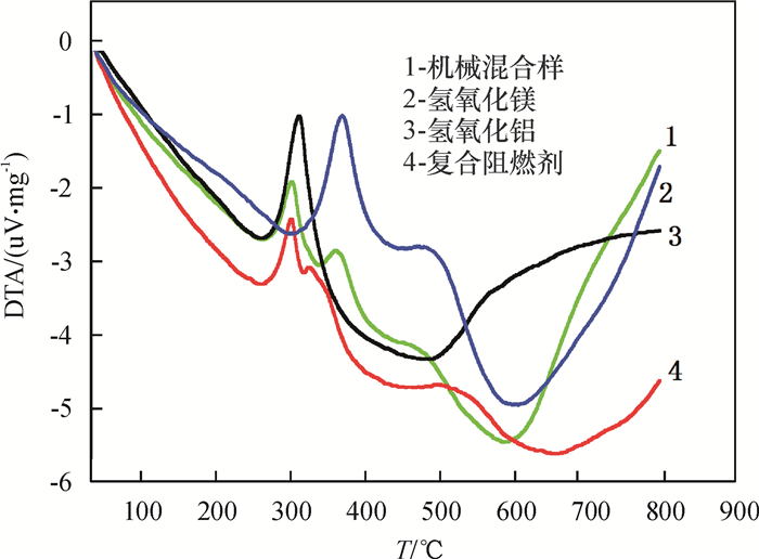 由图 8中DTA曲线可知,复合阻燃剂存在两个放热峰,其中250~300 ℃为氢氧化铝的放热峰,300~ 500 ℃为氢氧化镁的放热峰,但放热峰的强度明显减弱,这是因为氢氧化铝与氢氧化镁产生协同阻燃效应,吸热量更大,由于复合阻燃剂燃烧时放热峰更小,从而增强了复合材料的热稳定性.