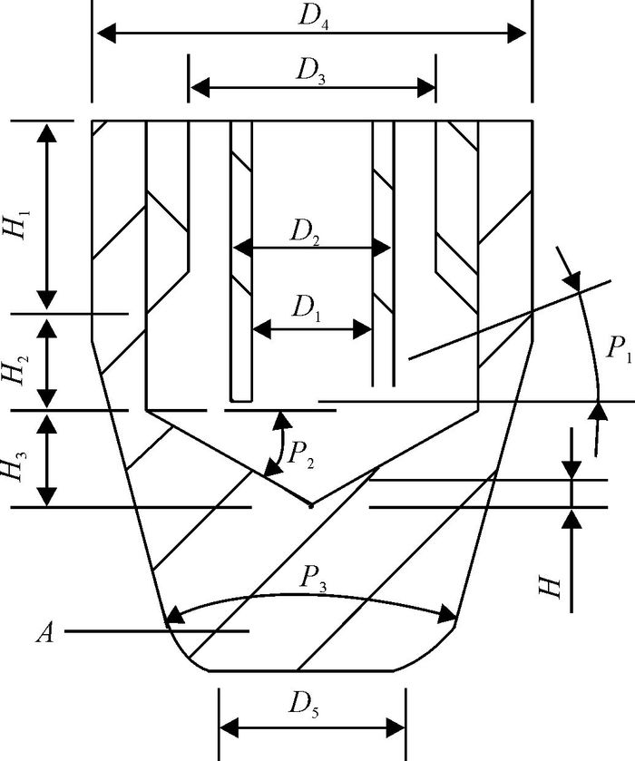 基于以上分析,本文对电极结构进行了优化设计,设计电极冷却腔底凹角为30°,水管与冷却腔底距离为2 mm.同时,图 7显示出了上述6个模型中冷却能力最好的模型Ⅲ的电极冷却腔水流速度分布云图,从图中可以看出,在腔底处存在一个扇形的水流低速场,影响了此处的水流与电极内腔表面的换热.为了减弱这种影响,本文对冷却腔底开设了一个盲孔,如图 8所示,并设置了3种方案(如表 2所示)对盲孔深度与孔径大小对电极散热能力的影响进行了研究.